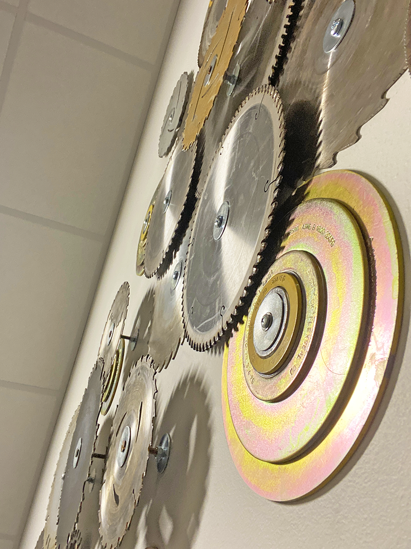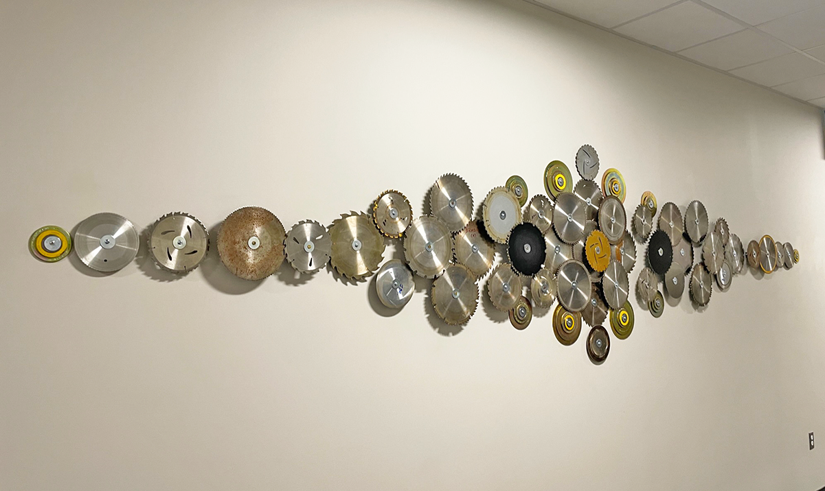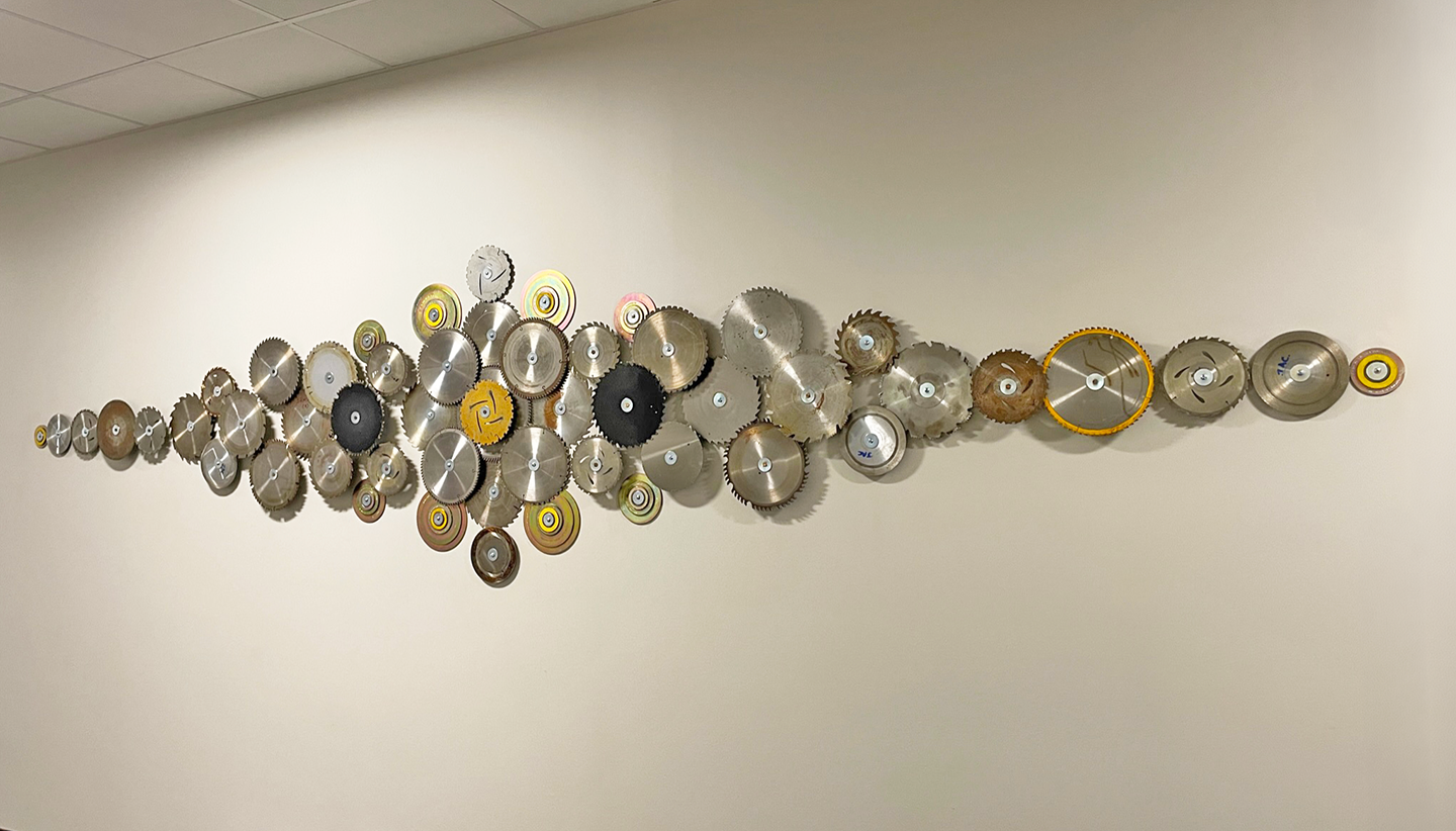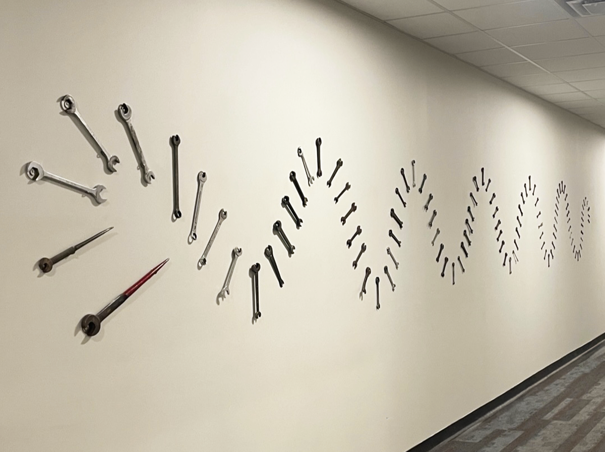 This expansive installation spans nearly 20 feet, featuring wrenches arranged in a bold, circular pattern that pulses with industrial energy. Each tool is carefully positioned, extending outward from the wall and transforms familiar implements of labor into a dynamic, sculptural rhythm. The composition evokes machinery in motion, echoing the precision, strength, and grit of the Millwright trade. It is both a visual and visceral homage, honoring the skill, dedication, and enduring legacy of the Millwrights within the training center.