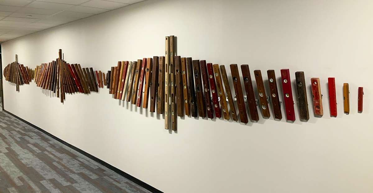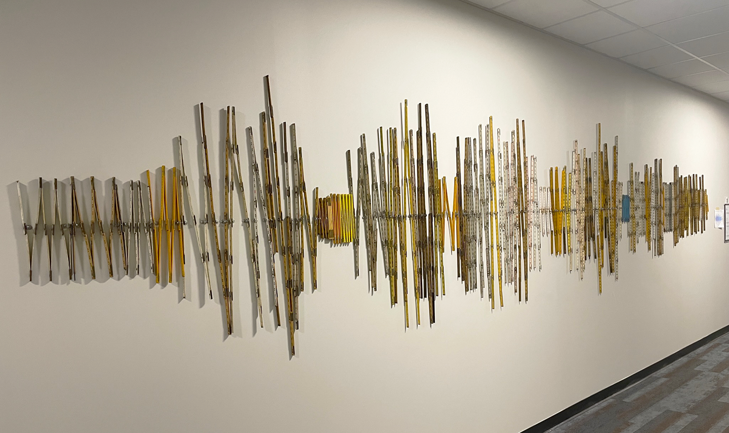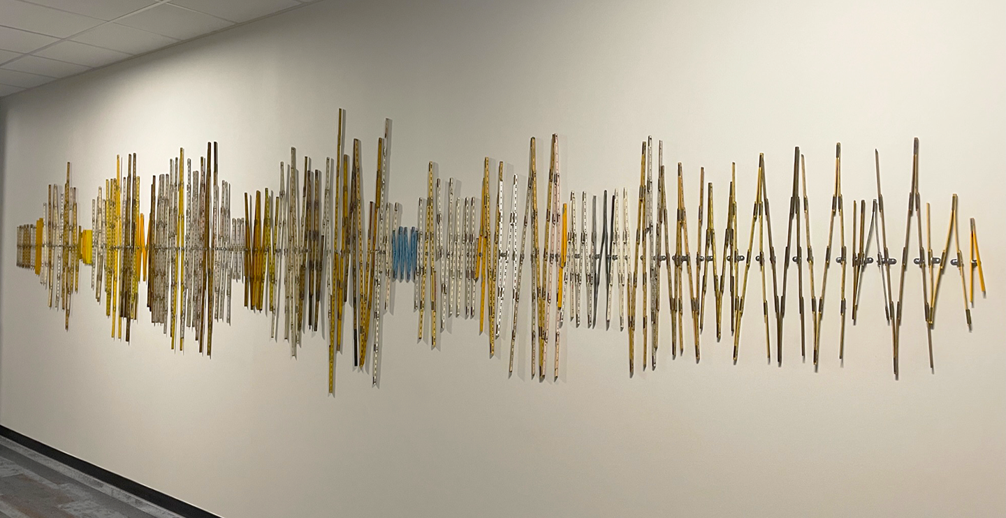 The work bridges language and labor, turning the spoken identity of the training center into something measurable, tangible, and built by hand. The rulers; tools of precision and trade, become the visual rhythm of the name itself, capturing the cadence, rise, and fall of sound. In this way, the building quite literally holds its own voice within its walls.