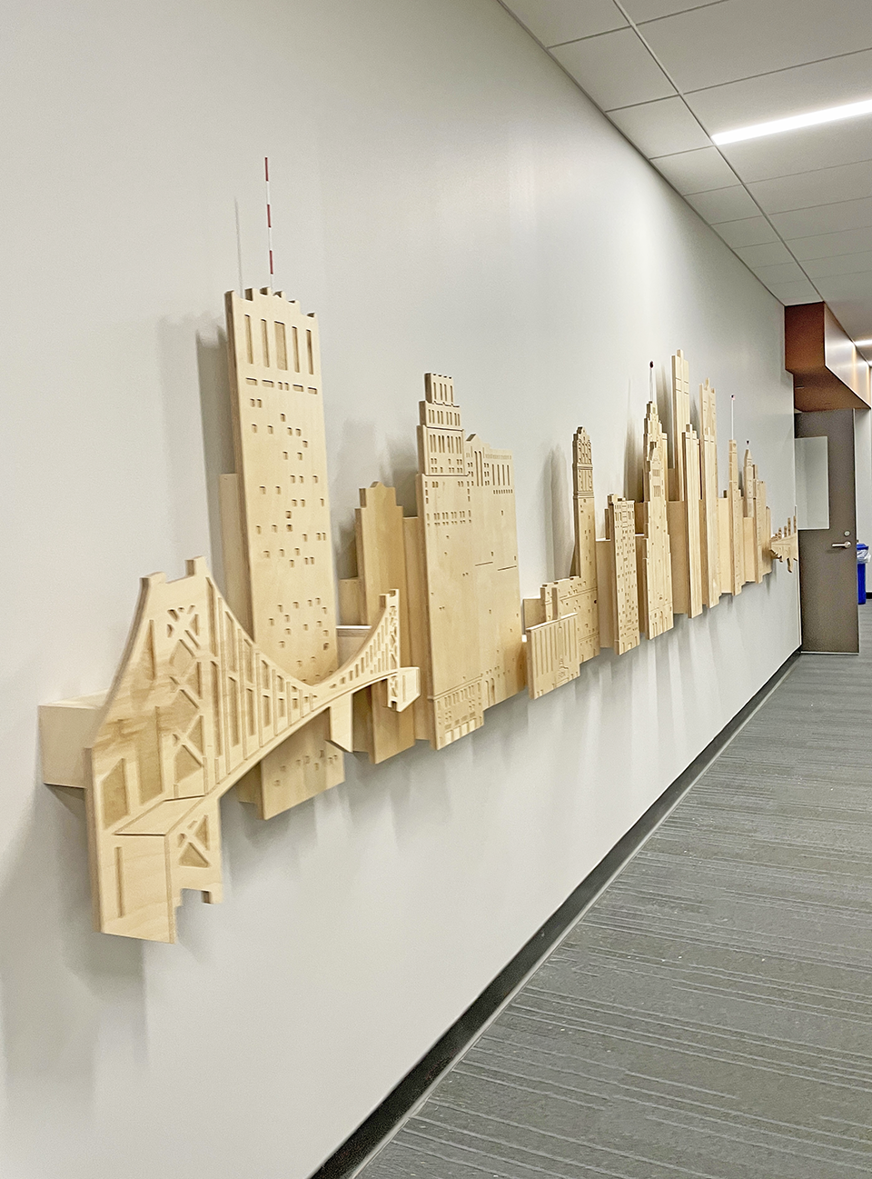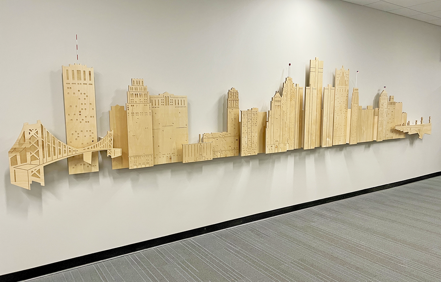 Created for the Michigan Regional Council Carpenter & Millwright Detroit Training Center, this five-piece installation honors Detroit’s industrial backbone and the enduring grit of the trades that built it. Anchoring the lower foyer is a custom CNC-cut cityscape of Detroit. a precise, architectural rendering that pays tribute to a skyline forged in steel, labor, and resilience.