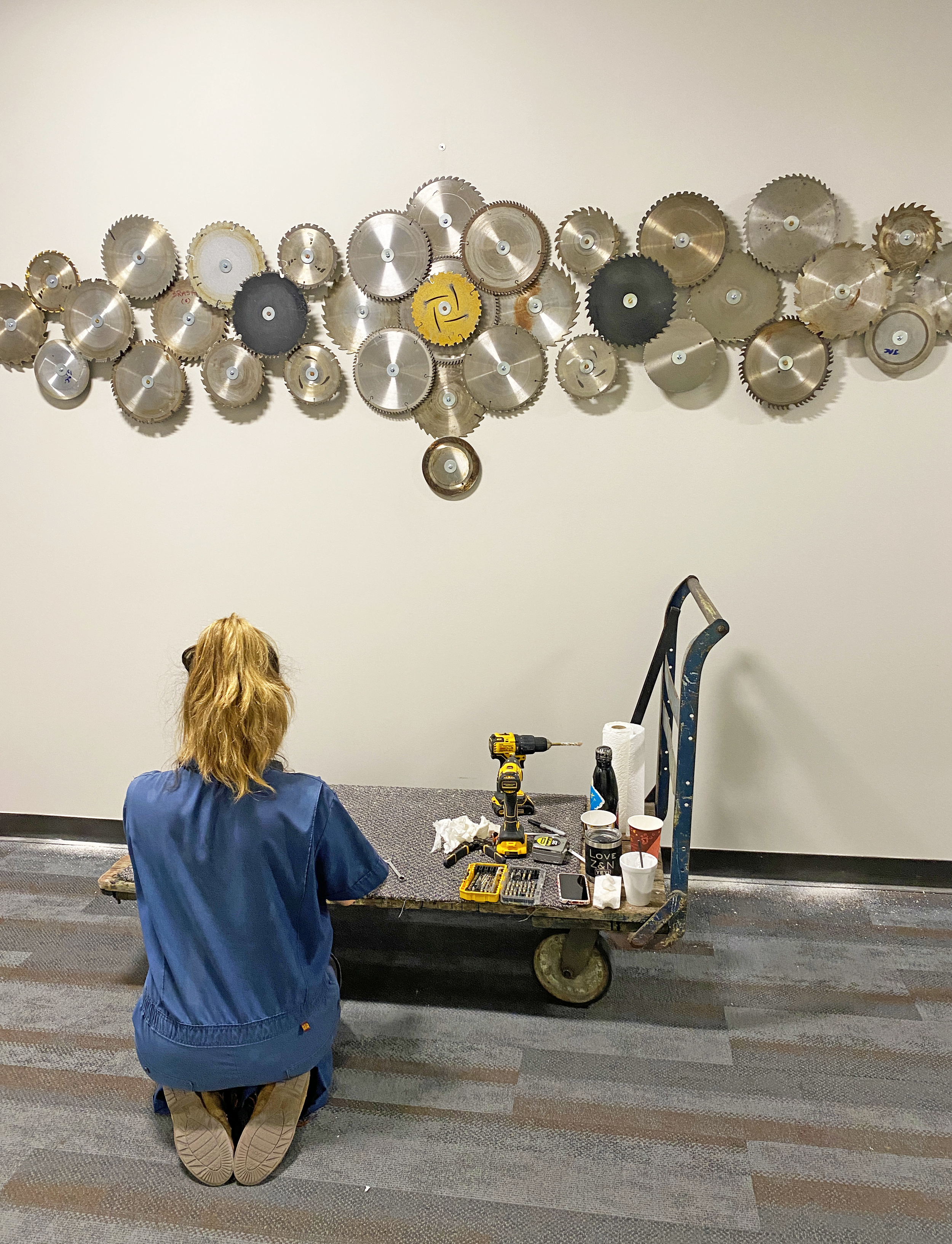 Constructed from reclaimed saw blades and specialized millwright machine seals, this sculptural wall Installation captures both precision and motion. The polished metal surfaces catch the light as you pass, creating a subtle shimmer that makes the work feel almost kinetic. It shifts and feels alive from every angle. Varying lengths extend outward from the wall, adding depth and dimension while maintaining a careful sense of balance. The interplay of sharp geometry and rhythmic spacing brings harmony to the space, transforming industrial materials into something unexpectedly luminous.