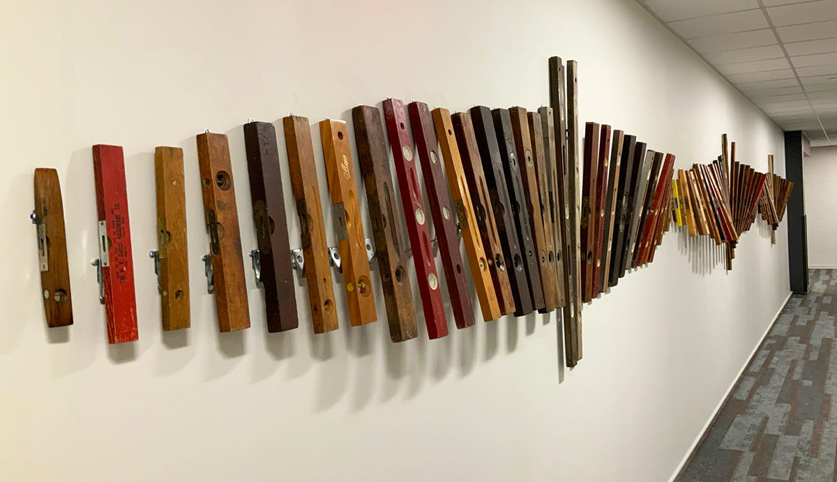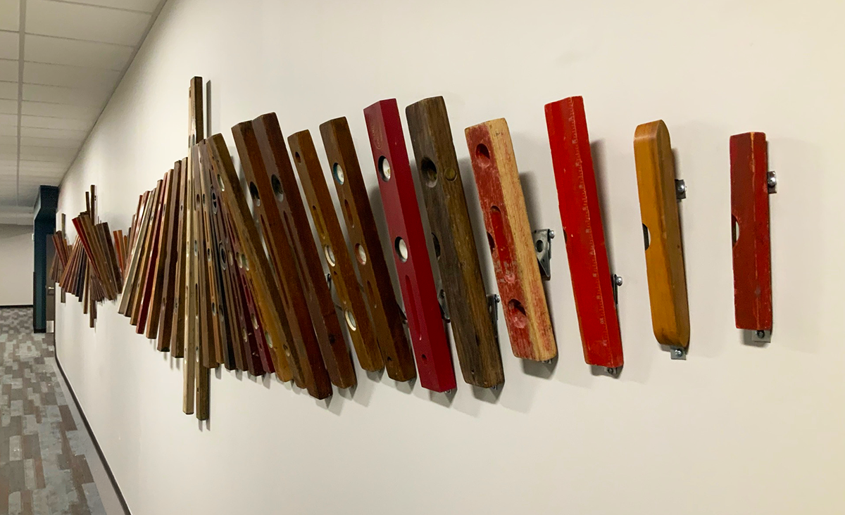 Beyond the entry, three large-scale sculptural works face the training floor, representing the Carpenters, Floor Layers, and Millwrights. The living crafts that continue Detroit’s legacy of building. Upstairs, antique wooden Levels are installed across extending the narrative and reinforcing the idea of knowledge rising through disciplined hands and shared skill.