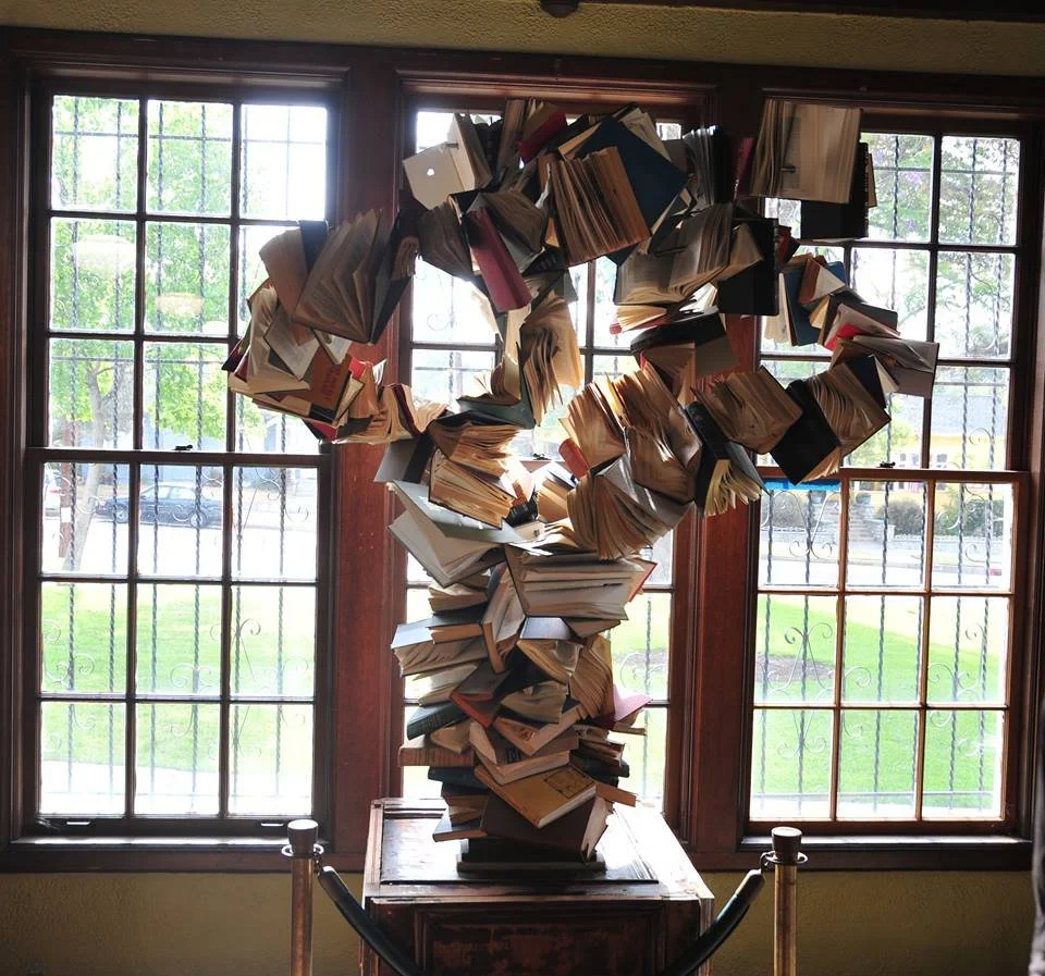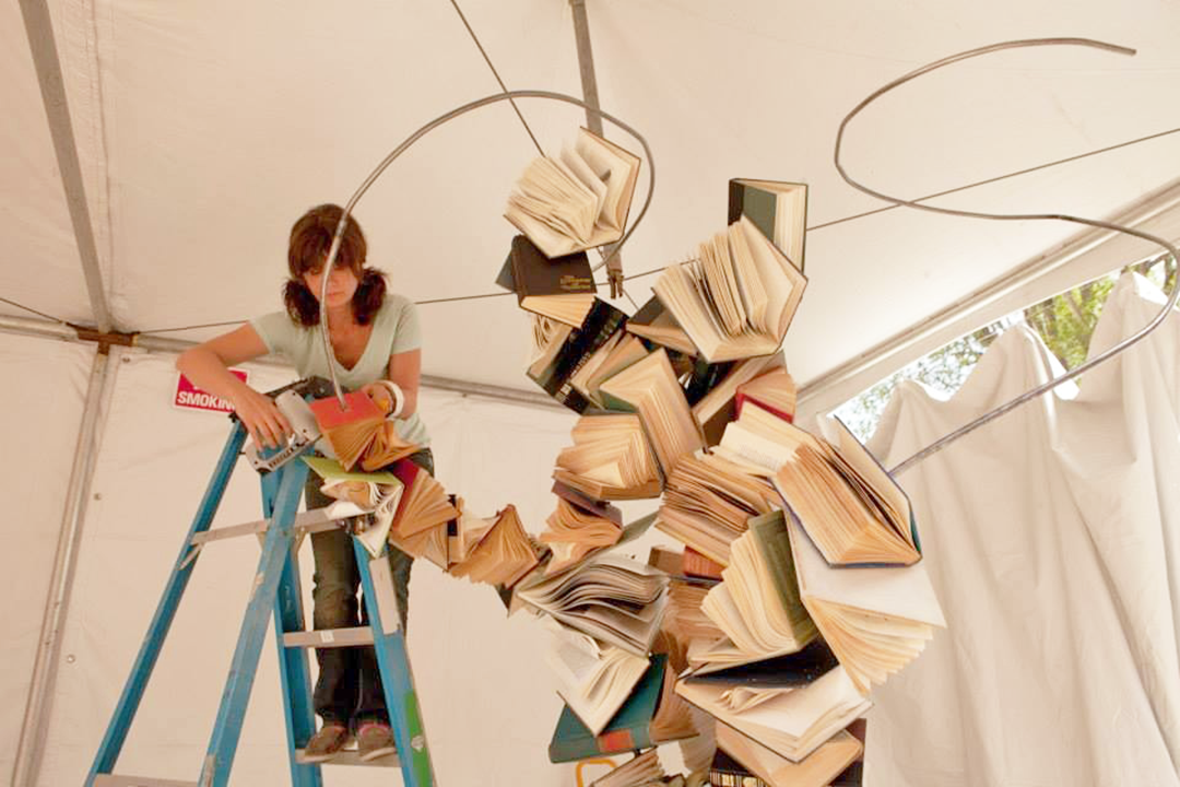 Invited to create a sculpture over the course of two days, I chose to challenge myself with a ten-foot spiraling tower of books. I wanted the piece to feel alive, not simply a static installation, but a work that captured the energy, urgency, and layered conversations of the festival itself.
