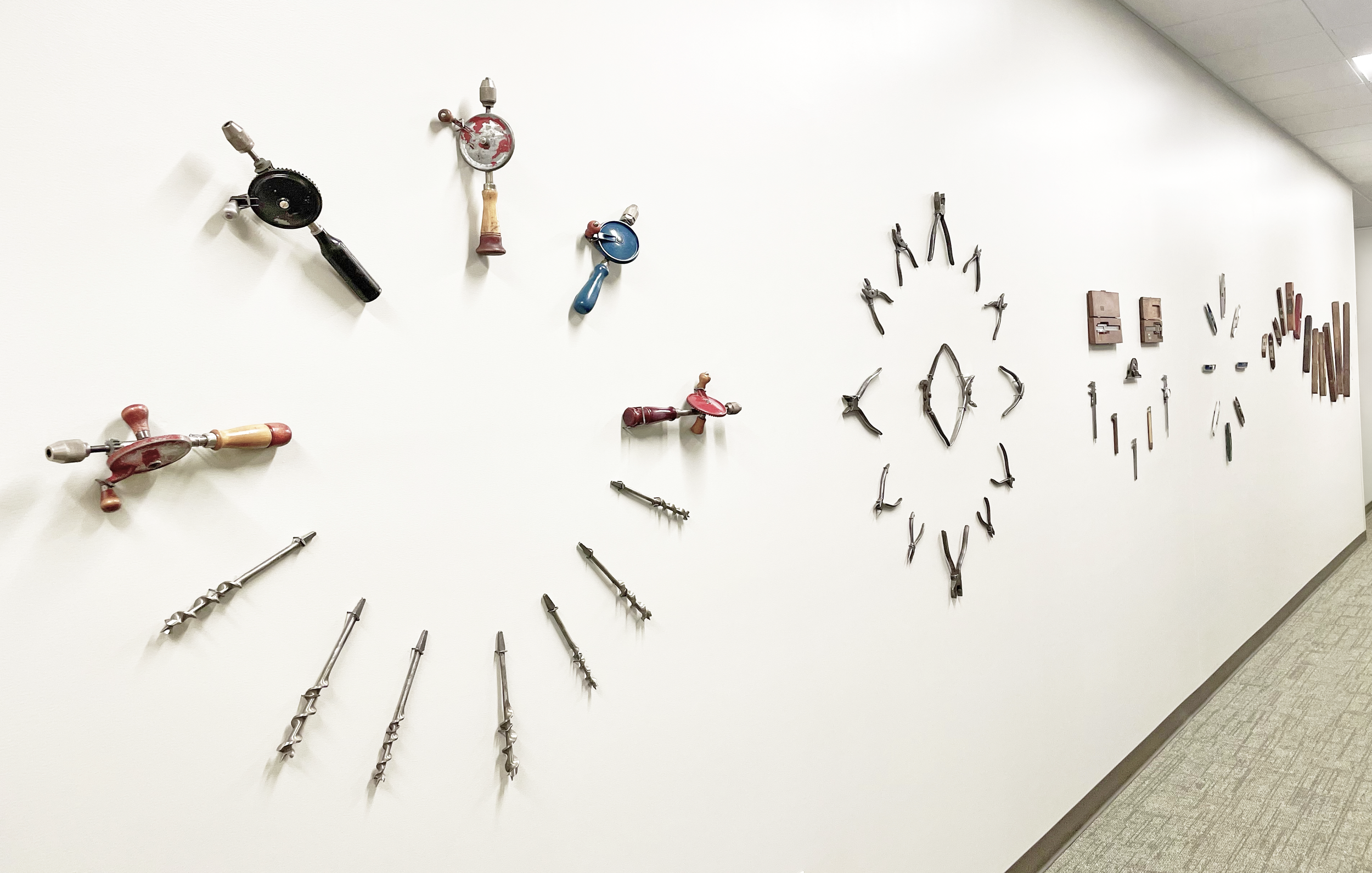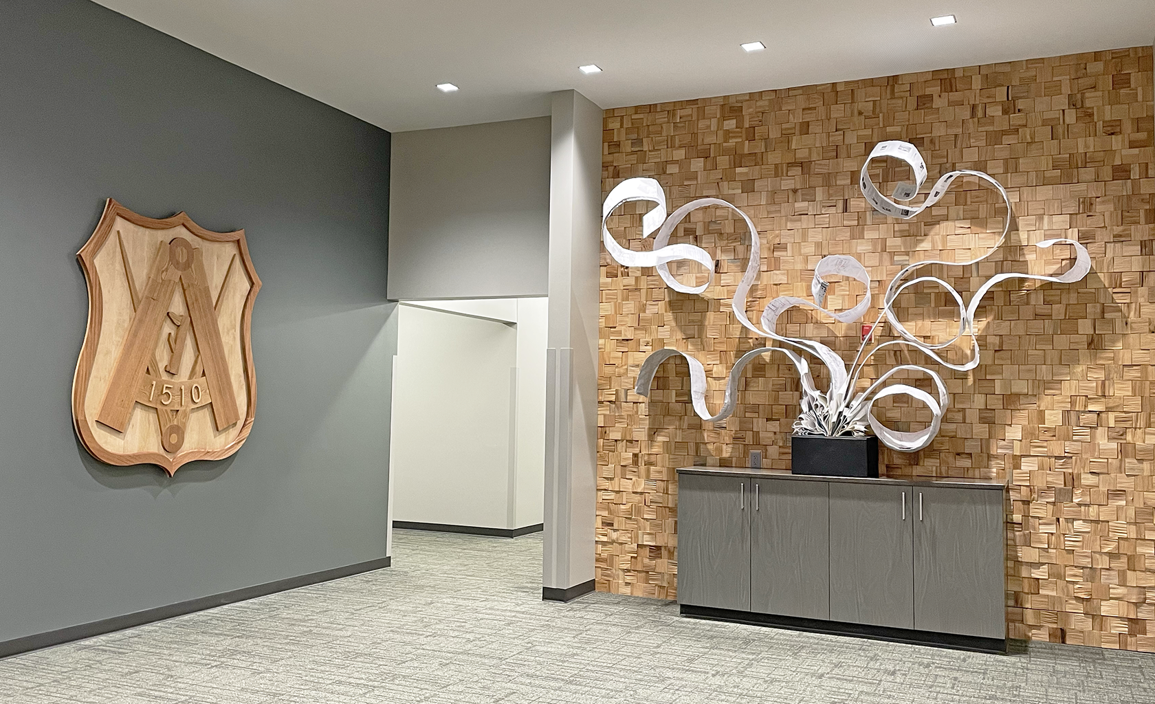 Surrounding this central work are nine original wall pieces that extend the narrative throughout the space. Each piece explores a facet of craftsmanship — structure, precision, labor, mentorship, and shared advancement — reinforcing the idea that the Union is not a single pillar but an interconnected system built through skill, trust, and collective knowledge. Together, the works transform the lobby and Training Center into more than an entry point; it becomes a visual testament to opportunity, continuity, and the enduring strength of those who build.