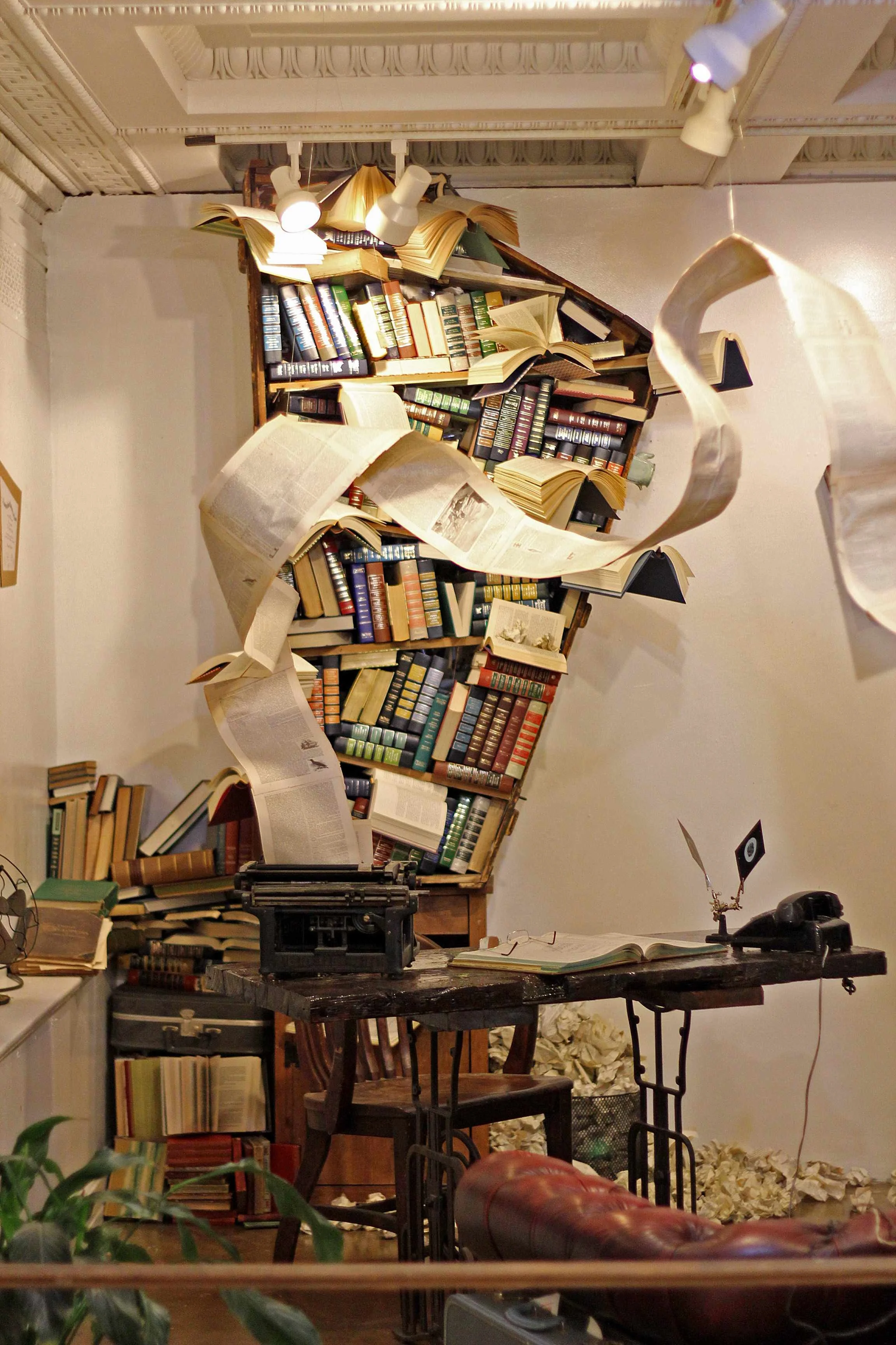 Many sculptures and installations Jena has done for the Bookstore have been widely documented in books, websites, and articles dedicated to lists of the “most beautiful bookstores in the world,” a title the space appears to accept without objection..